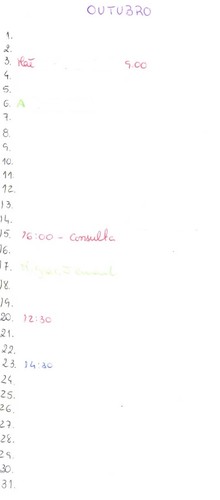 Na página de eventos, registo consultas médicas, reuniões etc... vermelho para a minha mãe, verde para trabalho e azul para mim.